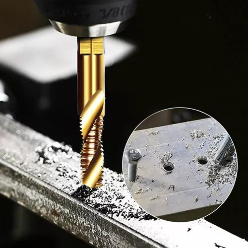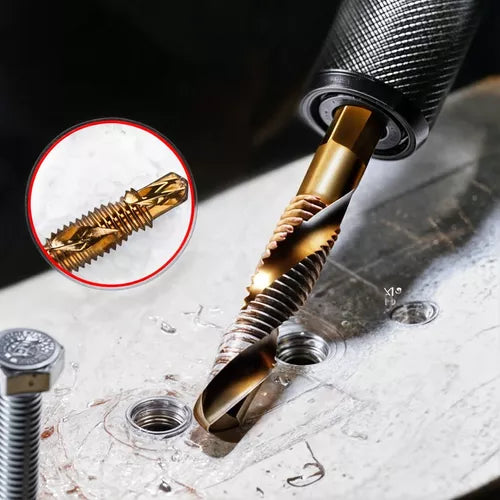 Aumente su productividad y taladre agujeros de manera eficiente y golpéelos sin siquiera tener que cambiar las brocas. Es todo lo que necesitas para taladrar y roscar los agujeros al mismo tiempo. ¡Obtenga todo lo que necesita para taladrar y roscar agujeros con las brocas todo en uno!